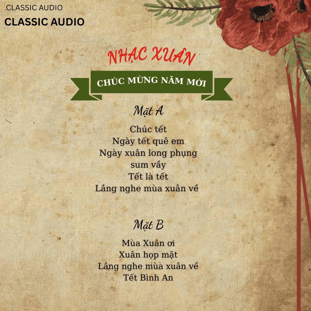 📼 Băng cassette 50 phút tuyển chọn những ca khúc nổi bật nhất qua giọng hát như: Chúc tết, Ngày tết quê em, Ngày xuân long phụng sum vầy, Tết là tết, Lắng nghe mùa xuân về....