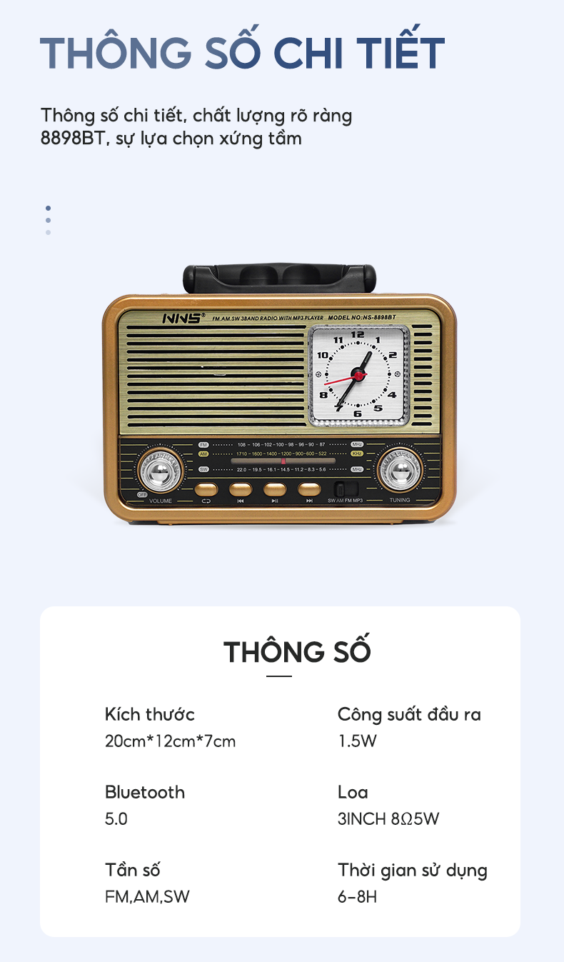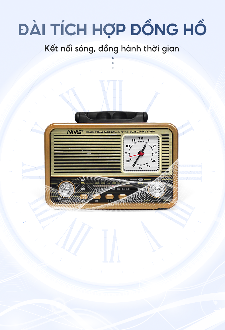 Đài Radio NNS 8898BT thiết kế tân cổ điển, kèm đồng hồ để bàn, bắt sóng cực khỏe đầy đủ tính năng nghe nhạc
