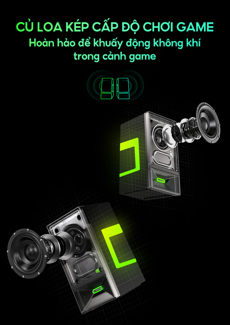 Được trang bị củ loa kép cấp độ chơi game, trong đó có loa siêu trầm kép kim giúp tạo ra âm trầm mạnh mẽ và sâu lắng, mang đến trải nghiệm âm thanh tuyệt vời cho các game thủ.