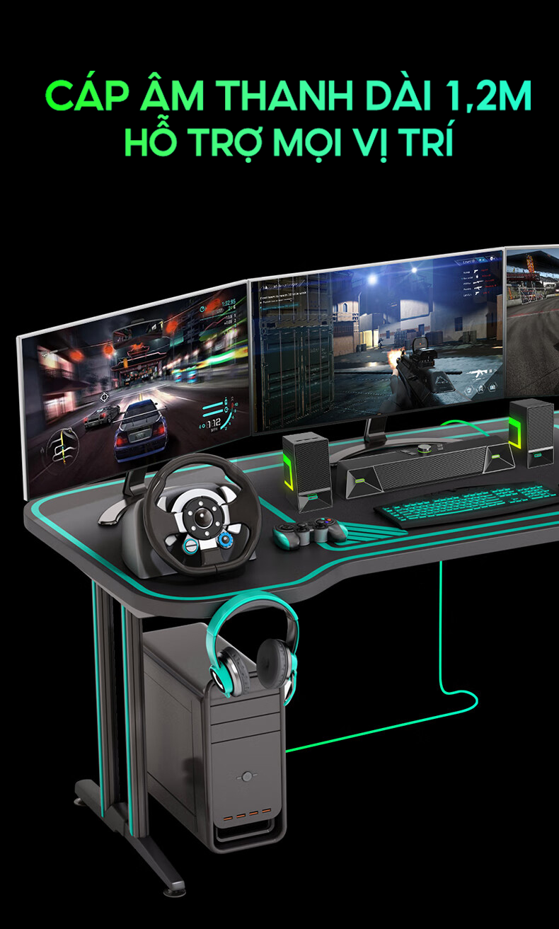 Với cáp âm thanh dài 1,2m, giúp bạn dễ dàng đặt loa ở mọi vị trí trong không gian mà không cần lo lắng về khoảng cách kết nối. Cáp dài này hỗ trợ việc bố trí linh hoạt, mang đến trải nghiệm âm thanh tối ưu cho cả chơi game, giải trí và xem phim, đồng thời vẫn giữ được tín hiệu âm thanh ổn định và chất lượng cao